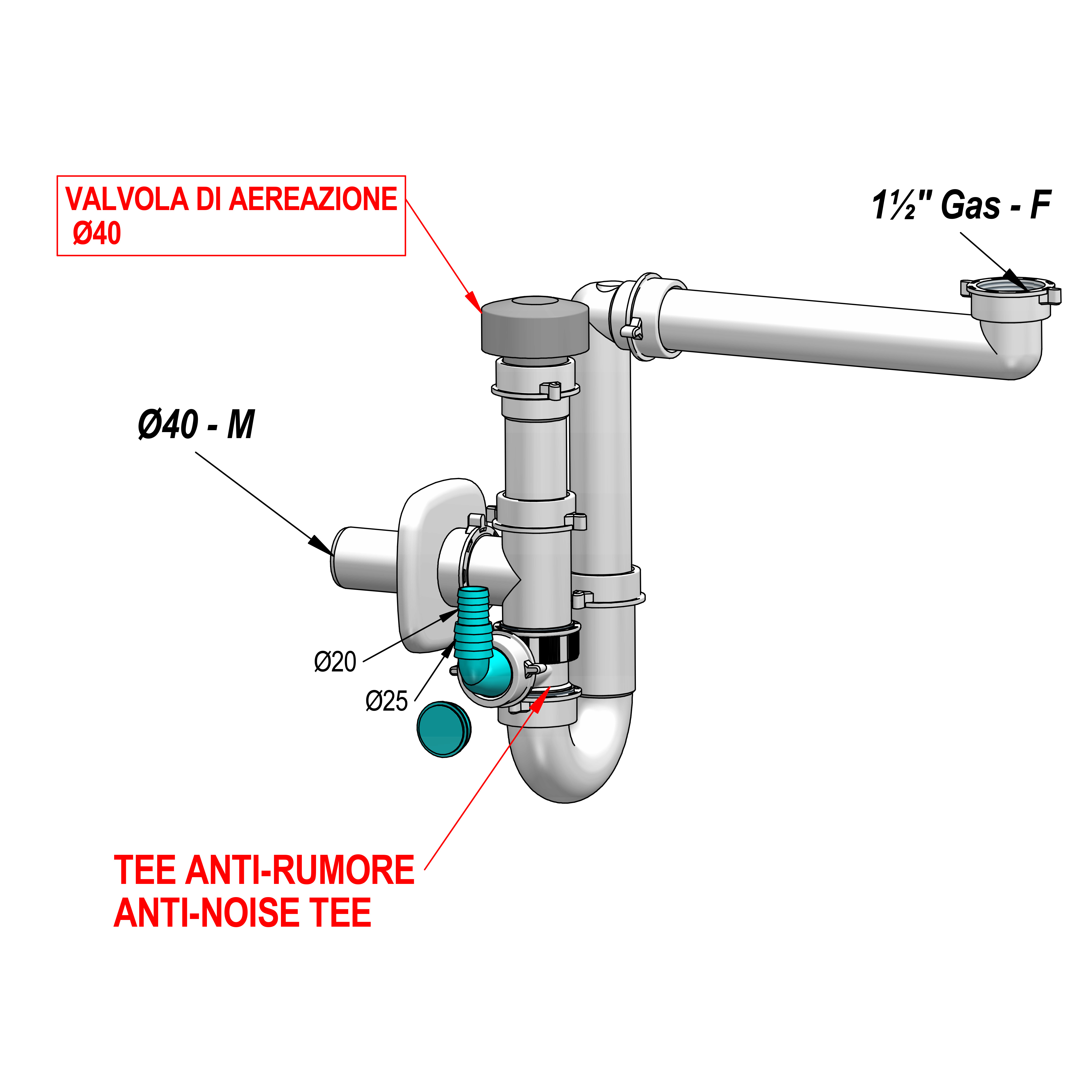 Sifone per lavelli completo di TEE antirumore e valvola di aerazione
